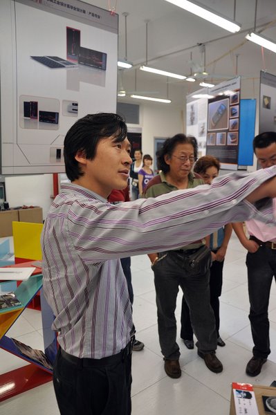 工业设计系副系主任郑伯森副教授为领导讲解毕业展