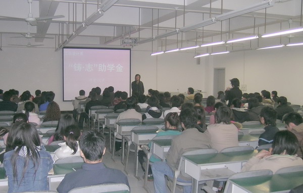 首届助学金颁发仪式于2007年3月14日下午4点在A405公共教室由王玲老师主持,系主任杨为渝教授做为颁奖嘉宾,系部老师全体参加。在此衷心感谢为我系提供“铸·志”基金的社会匿名人士!