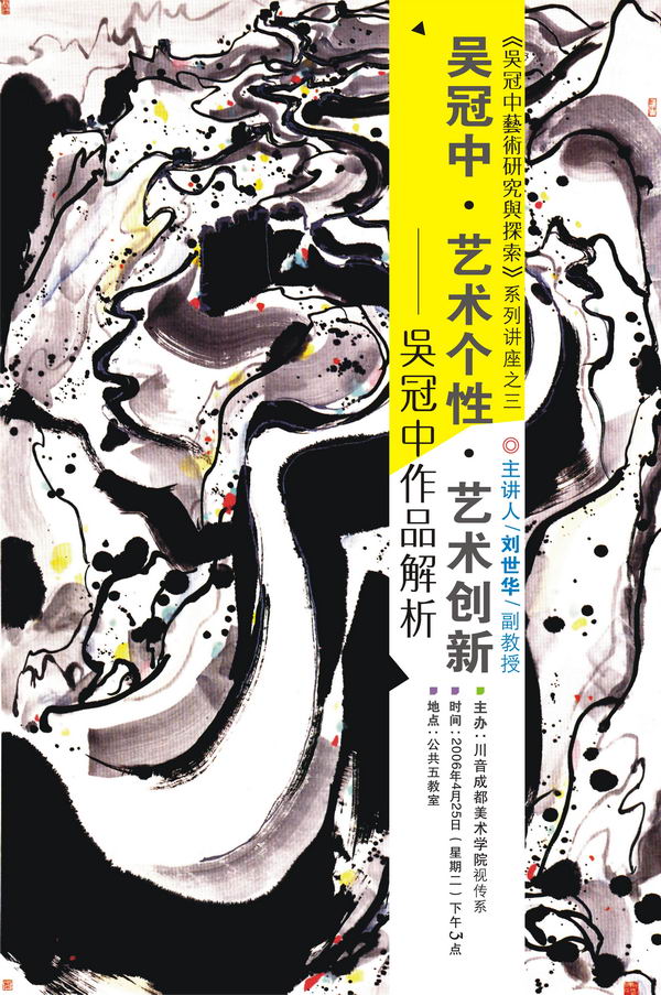 2006年4月25日下午,在川音成都美术学院公共多媒体教室,视传系刘世华副教授作了题为《吴冠中•艺术个性•艺术创新 —吴冠中艺术作品解析》的学术讲座。这是他《吴冠中艺术研究与探索》系列讲座的第三讲。前两讲是在去年先后举办的,题目分别为:《吴冠中抽象彩墨艺术之赏析》、《是非冠中 —探寻一个饱受争议的艺术家的艺术轨迹》。