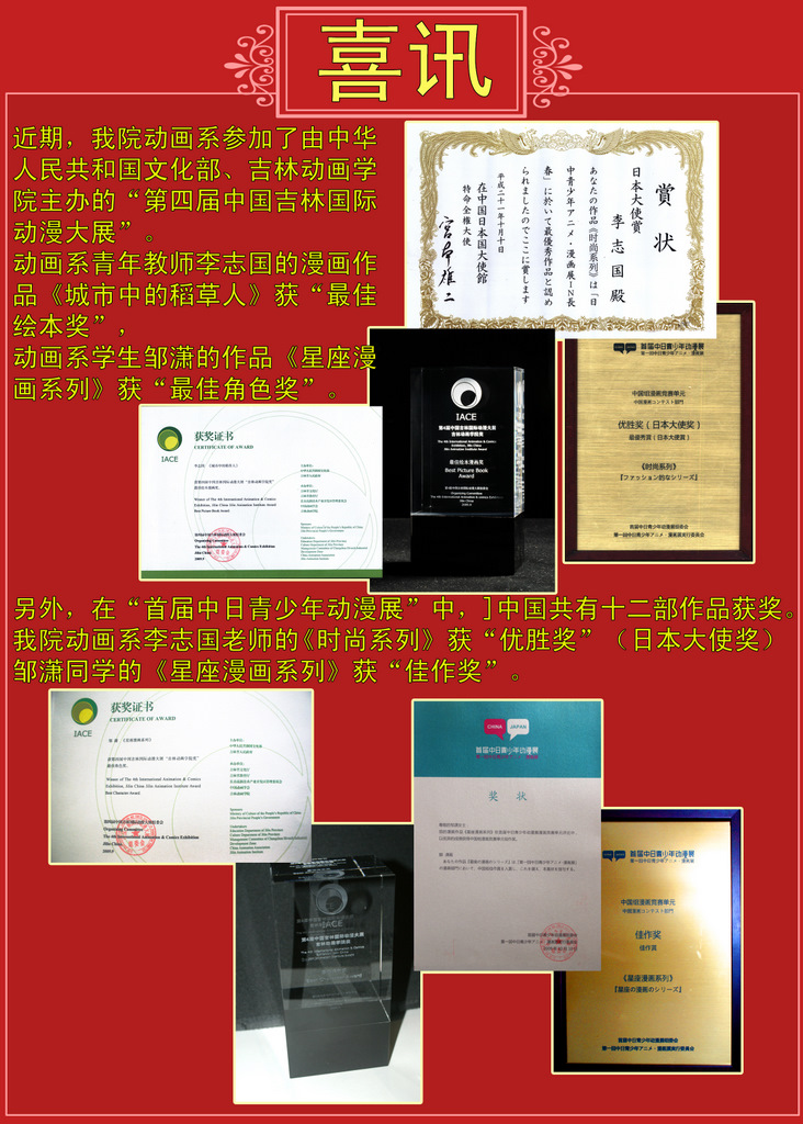 另外,在“首届中日青少年动漫展”中,中国共有十二部作品获奖。我院动画系李志国老师的《时尚系列》获“优胜奖”(日本大使奖)和邹潇同学的《星座漫画系列》获“佳作奖”。