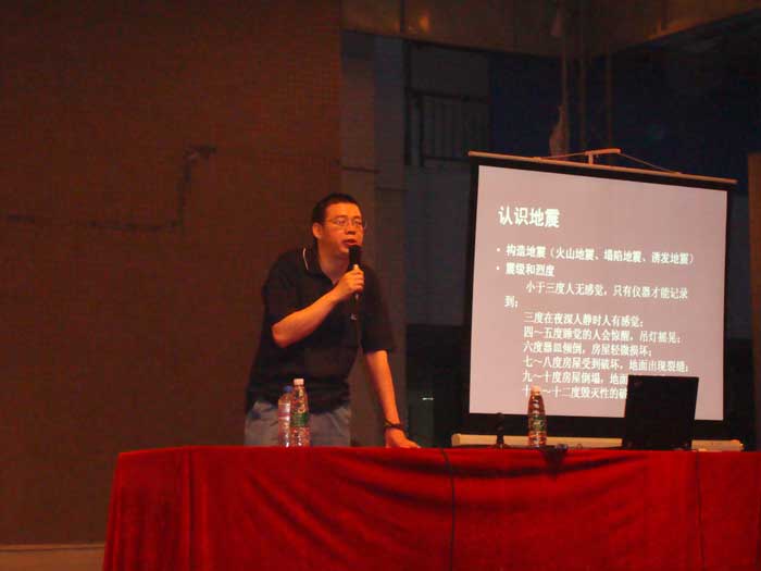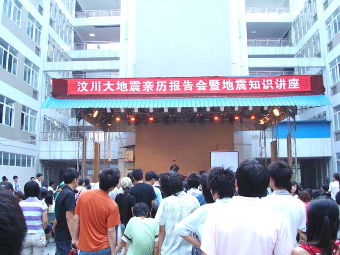 四川大学副教授、中科院地质学博士甘露为同学讲解了本次汶川大地震的成因、成都平原的地质结构、地震的基本常识等,明确了成都是安全的。6--7级的余震不可能对成都主城区、新都主城区造成严重影响。符合要求的建筑都是安全的,同学们可以放心回到寝室休息、回到教室上课。甘教授还希望同学们能消除恐惧,他讲到,恐惧止于理性,止于科学,同学们应该逐步恢复正常的生活学习秩序。