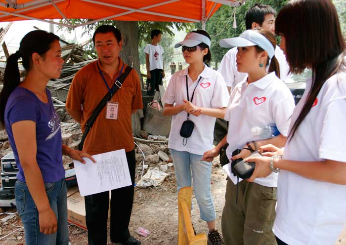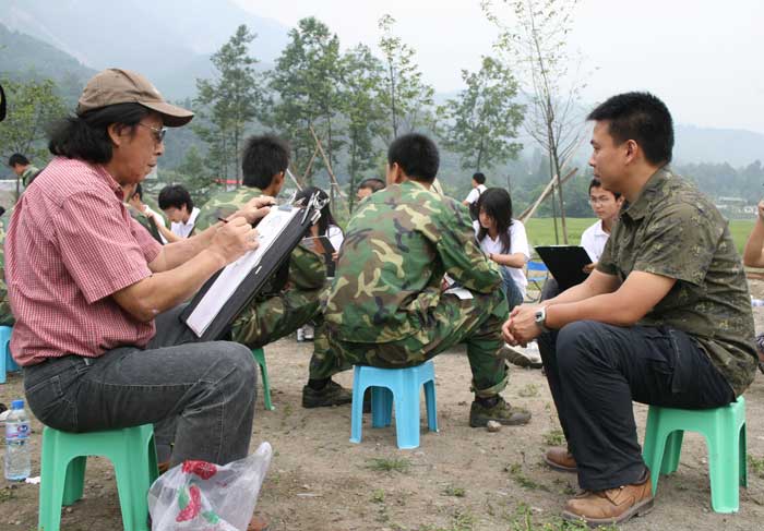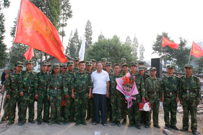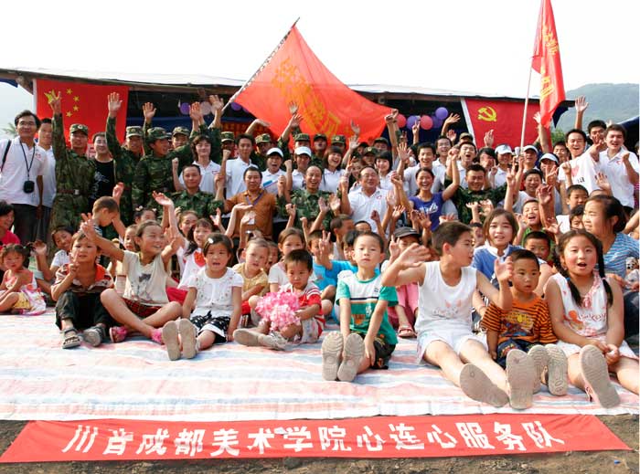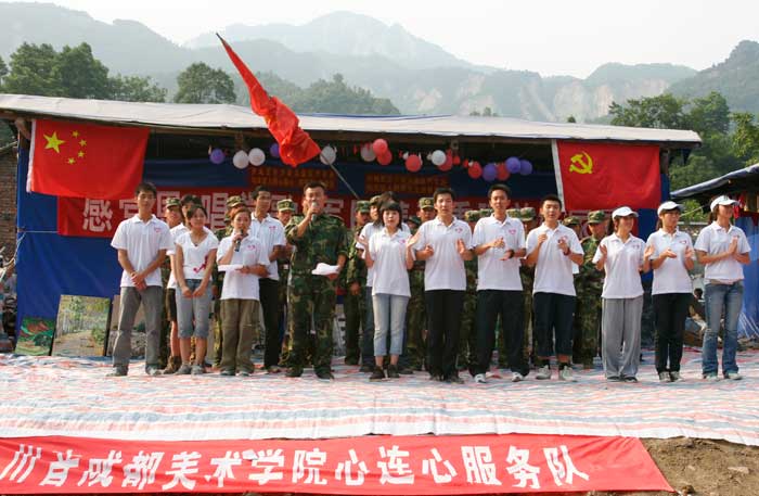 6月28日上午,川音成都美术学院大学生心连心服务队的师生们在学院马一平院长,党总支鲁道甫书记的带领下,一行三十余人利用假期的休息时间,到灾区一线去对当地灾民和驻地官兵进行服务和慰问。