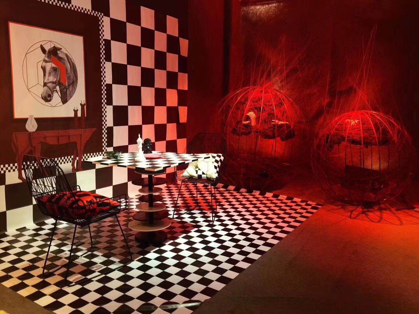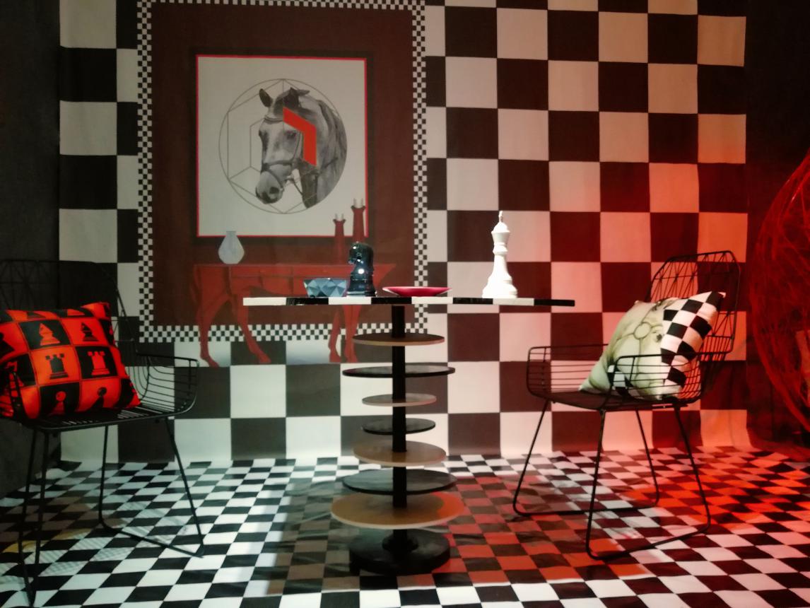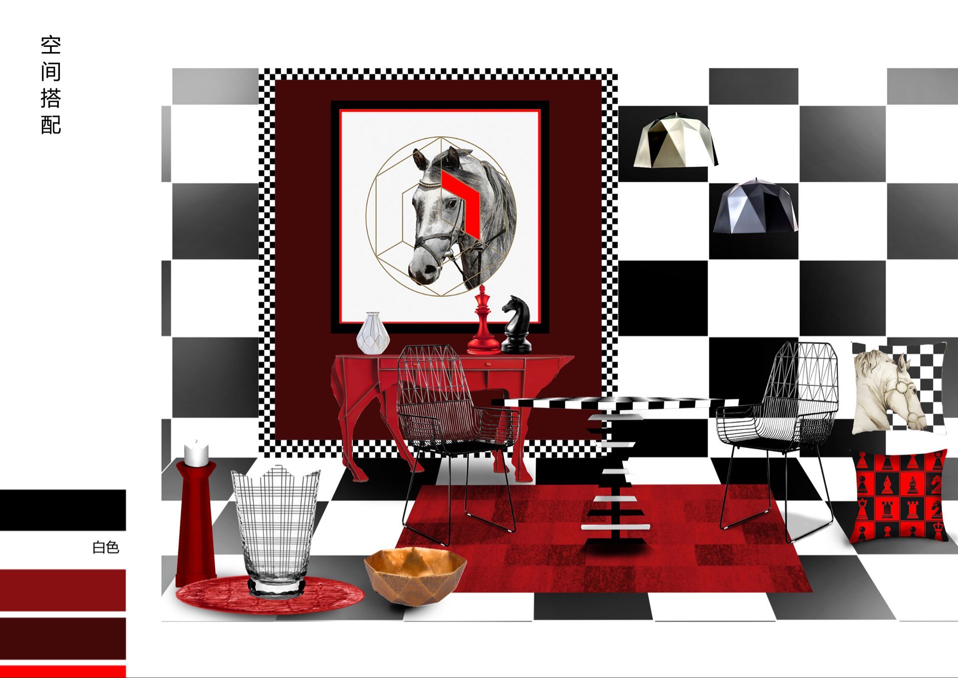 作品借鉴(设计思路):本次设计是从国际象棋中提取棋子“王”、“后”、“马”的形象为元素,在将其融入到家具以及陈设品当中,采用波普风格。运用大量的方格来体现出棋盘的特点,让人有种身临与一场精彩的象棋游戏当中的错觉。