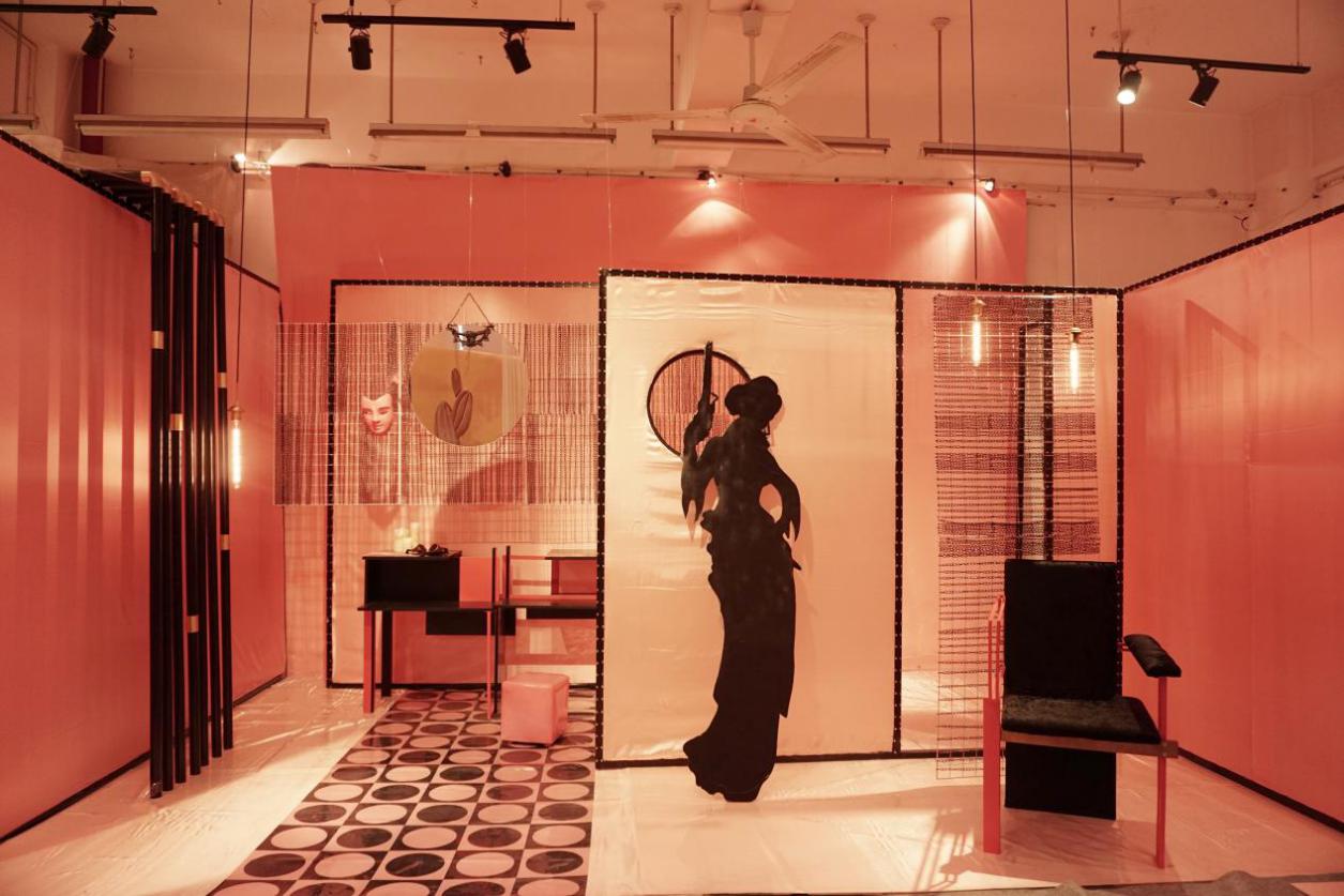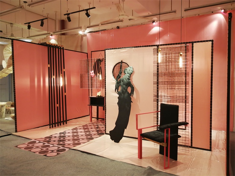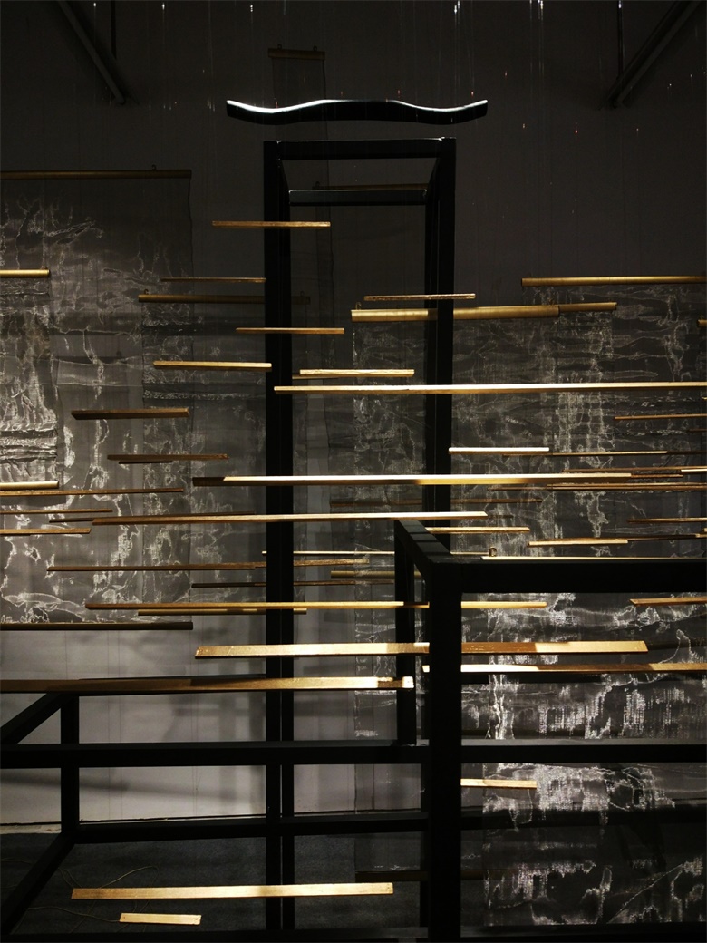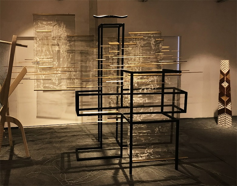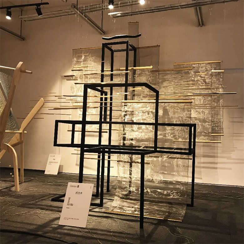 设计说明:视点的转换和交替构成了矛盾空间,模棱两可的视觉效果,制造出空间混乱,光影的渗入,视线的挪转呈现出不同的形体关系,二维及三维的纠缠,虚实的变换木者,春生性。农之本也。质密且可塑性高用折纸的手法处理方木构筑出转折,空间,主次,角度线条悖论山水水墨画丝绸之路颠形倒序在,大主题是“丝路”,主色调为金色的背景下,我们没有纠结于“丝路”本身,而是更加寻求突破,“丝路”不仅仅是丝绸之路,它也可以是“寻找灵感的思路”,我们在设计中表明一种专属于年轻人的设计态度,采用矛盾空间将三种宋代不同的家具融为一体,强调主次,区分虚实,一个非常确实的框架中间架空几组丰富的藤条背景,让它在每一个角度都能呈现出不同的状态,给人不同的惊喜。