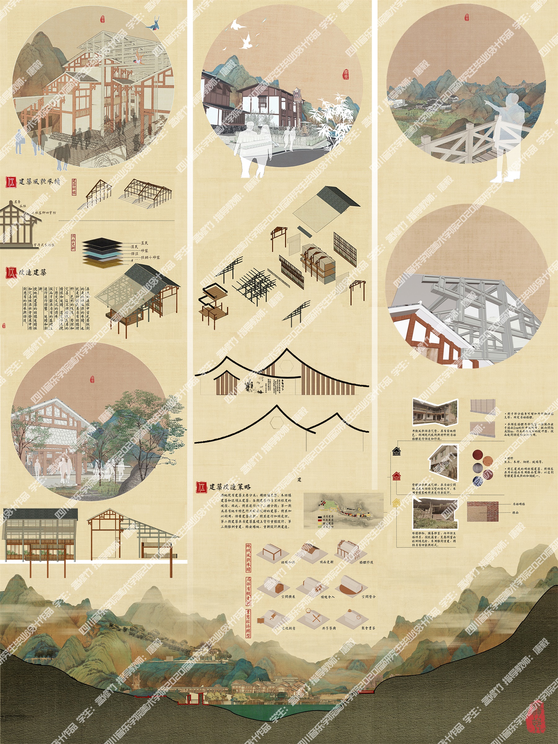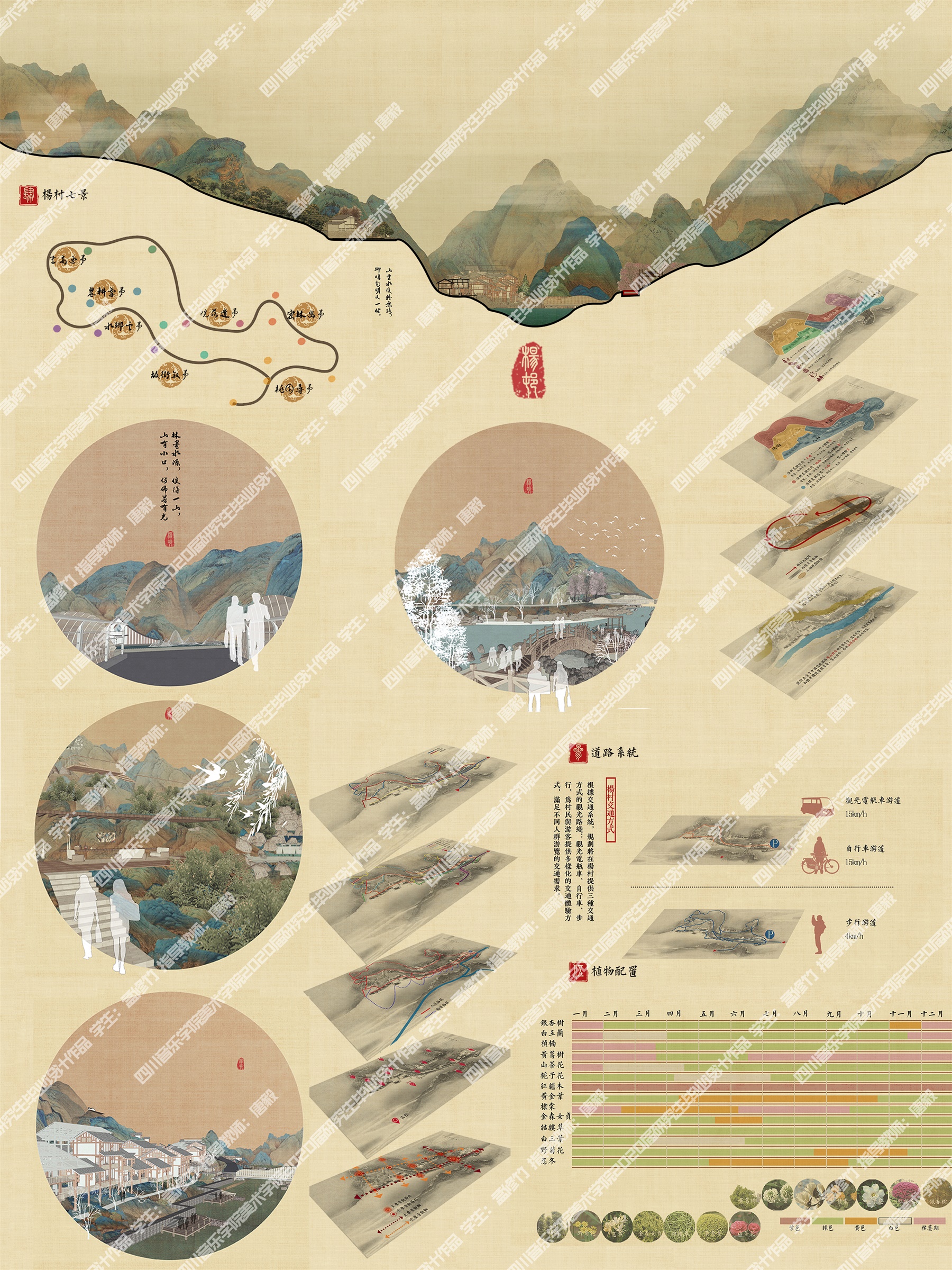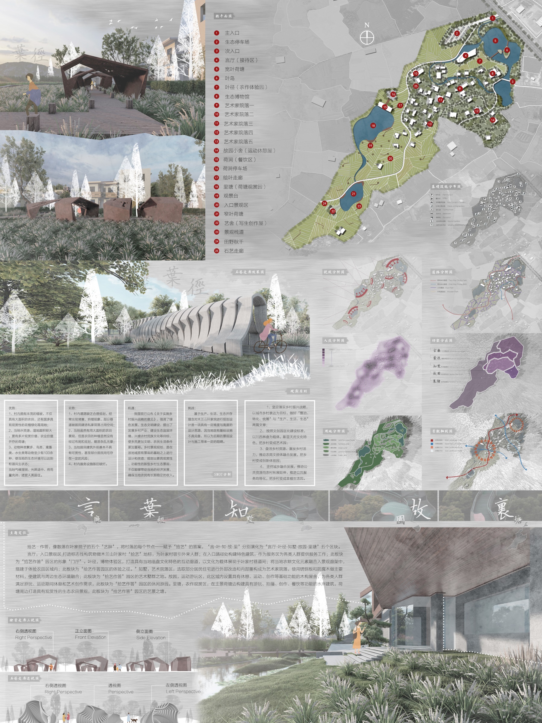 马海霞,马子淇,吴稣欣,孟修竹四位同学,对乡村振兴课题展开了深入研究,分别以“言、叶、知、故、里”、“西蜀旌城”“乡土的诗意”和“中国山水画”为灵感,提出的景观方案,展现了乡村的美丽风光,以及在新时期条件下,如何让人与自然的和谐共生,让乡村比以往更加焕发活力。