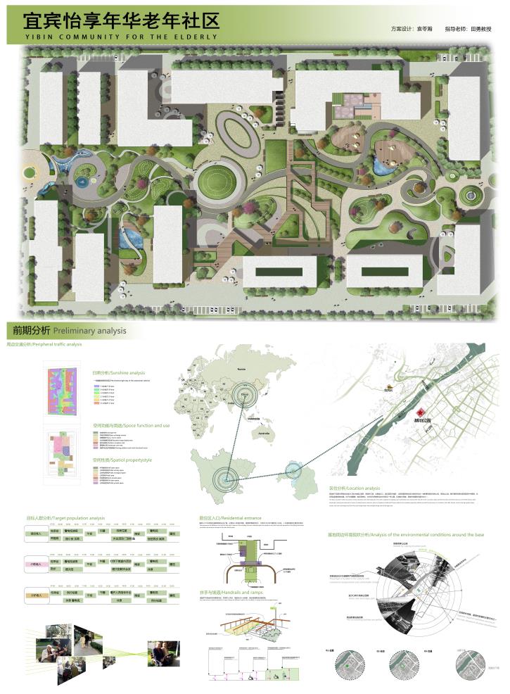 袁苓瀚同学关注到人口老龄化的问题,以“怡想年华”为理念,对老年社区的景观设计展开了研究,提升老年人的生活居住环境,积极应对人口老龄化。