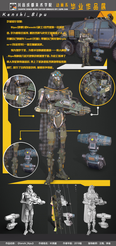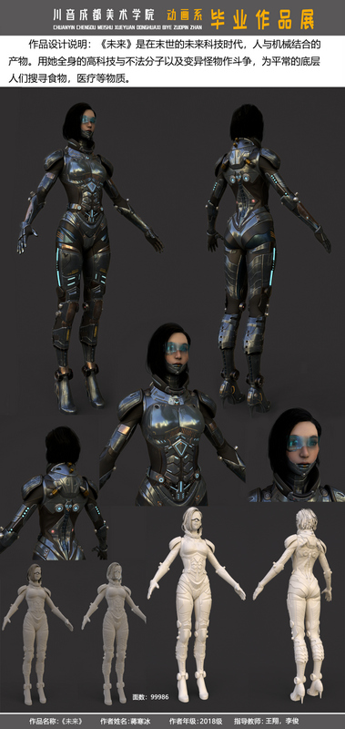 1、蒋寒冰 作品《未来》是在末世的未来科技时代,人与机械结合的产物。用她全身的高科技与不法分子以及变异怪物作斗争,为平常的底层人们搜寻食物,医疗等物质。