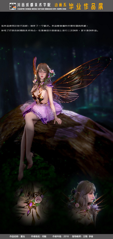 3、闫敏 作品《夏虫》该作品使用次世代流程,制作了一个精灵。作品整体偏向华丽轻盈的风格,参考了巴洛克时期的美术特点,在原画设计的基础上进行二次创作,是半原创作品。