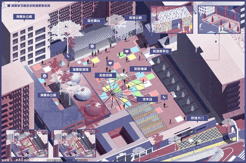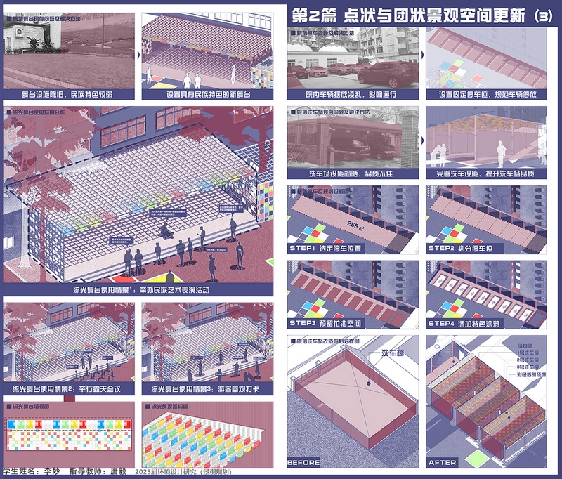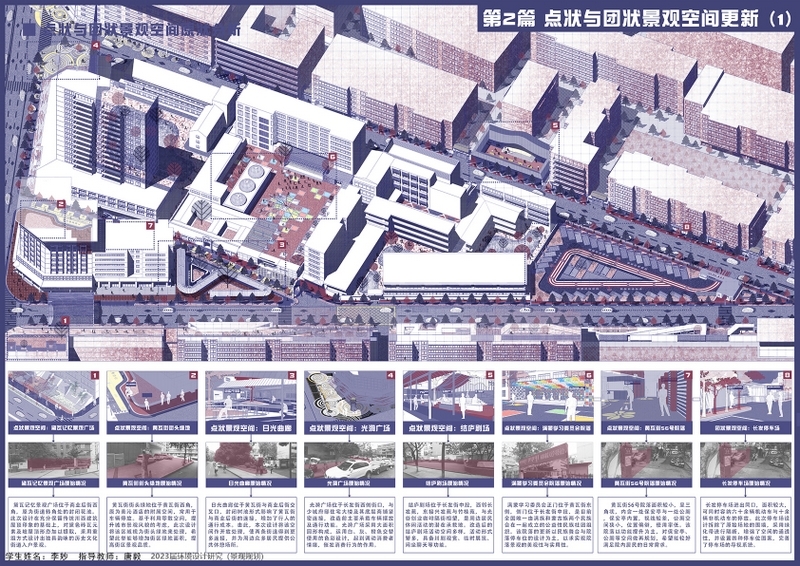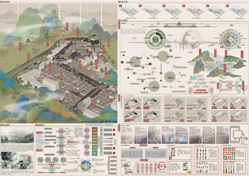 作品简介:本设计位于湖北省十堰市郧西县春桥社区,设计在保持社区原有空间结构的基础上,尽可能地保留了社区独特的历史特色,对老旧社区公共空间进行智慧弹性设计改造。设计将“空间”作为载体,“时间”作为变量,“文化”作为内容,构建“多元化”的社区空间,并运用可组合的多元组件,使其更具弹性,并创造出具有可塑性的公共空间,提高市民对社区生活的参与程度,满足居民多元化需求。使原本死寂的空间变得鲜活起来,从而提高社区空间的品质。