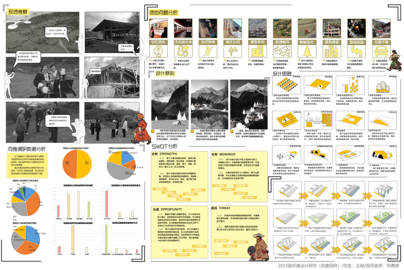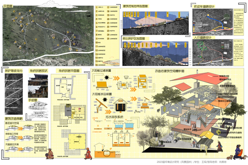 作品简介:本次设计位于九寨沟县中查村格下古寨,格下古寨被为第四批传统村落。处在环境优美的山区之间,而古寨现有发展与时代有些脱节,古寨的文化随时间也消亡,古寨的活力随着人口的流失正在丧失。通过对当地进行实地考察后,分析村落景观保护中存在的问题,并结合乡村振兴的国家政策,设计上在保留古寨原有的风貌和格局下,以微介入的手段优化古寨现有建筑的功能保护性设计解当地生态环境被破坏、缺乏基础设施等问题,为当地居民提供生态宜居的生产生活环境,让当地历史文化得到保护与传承。传统村落蕴含着许多不可再生的非物质文化,对于它的保护,不仅是村落自身的保护,更是对中国传统文化和文明的保护和传承,这也是本次设计的初衷。